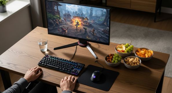 - Ne garder sur le bureau que l’essentiel : PC (ou console), écran, clavier, souris/manette, tapis, casque audio, support boisson (eau ou thé, à privilégier pour éviter déshydratation et taches).